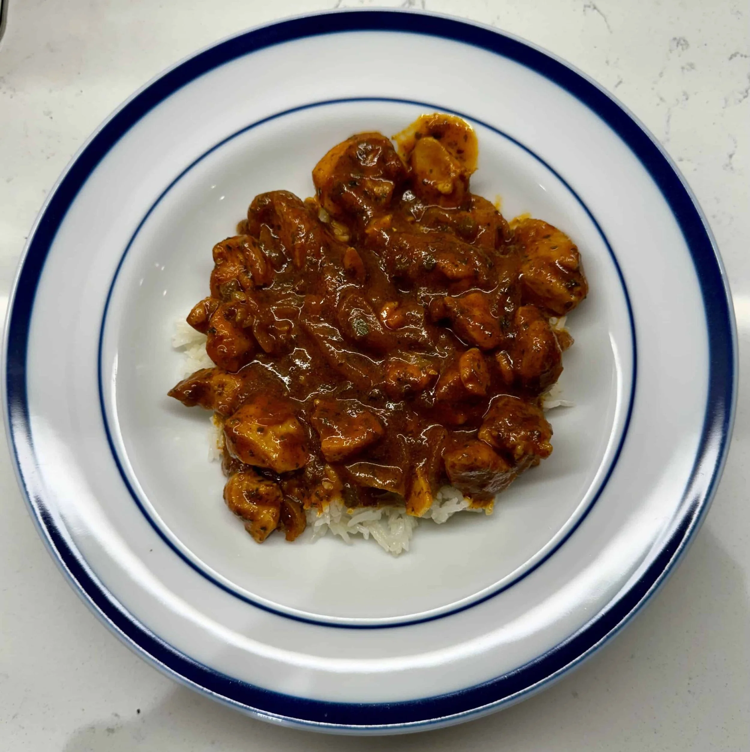 When chicken and rice are done cooking, add 2-4 spoonfuls of rice to plates or bowls, then top with 2-4 spoonfuls of the cooked curry chicken on top. Enjoy!