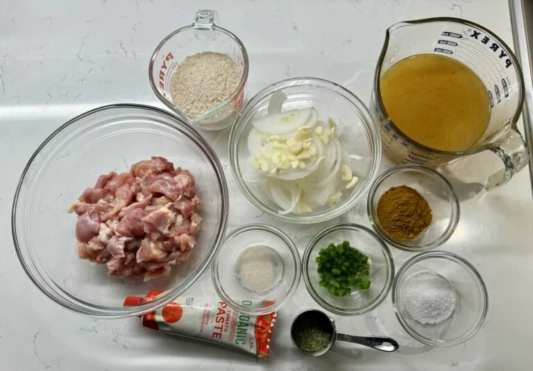 When onion have softened after 3-5 minutes, add the chicken or tofu (pat dry first) to the onion mixture. When seared after 3-4 minutes, add water, chicken or vegetable broth cilantro, curry powder, tomato paste, optional potatoes. Cover until chicken is cooked through, about 10 or 20 minutes depending on size of the chicken or tofu pieces. Add 1/2 cup water if too thick. If using optional whole, cut up chicken cook for 1 1/2 hours.Cook Rice