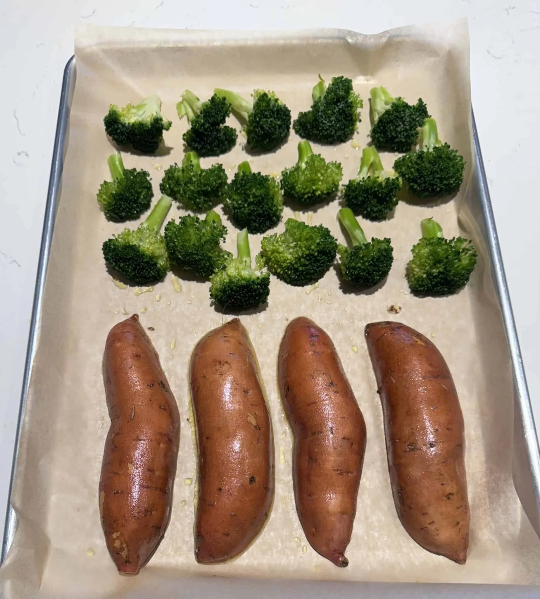 When timer goes off, remove chicken and let rest for 5 minutes. Check sweet potatoes and broccoli for doneness. Sweet potatoes should be soft when pressed. Broccoli should be slightly charred.