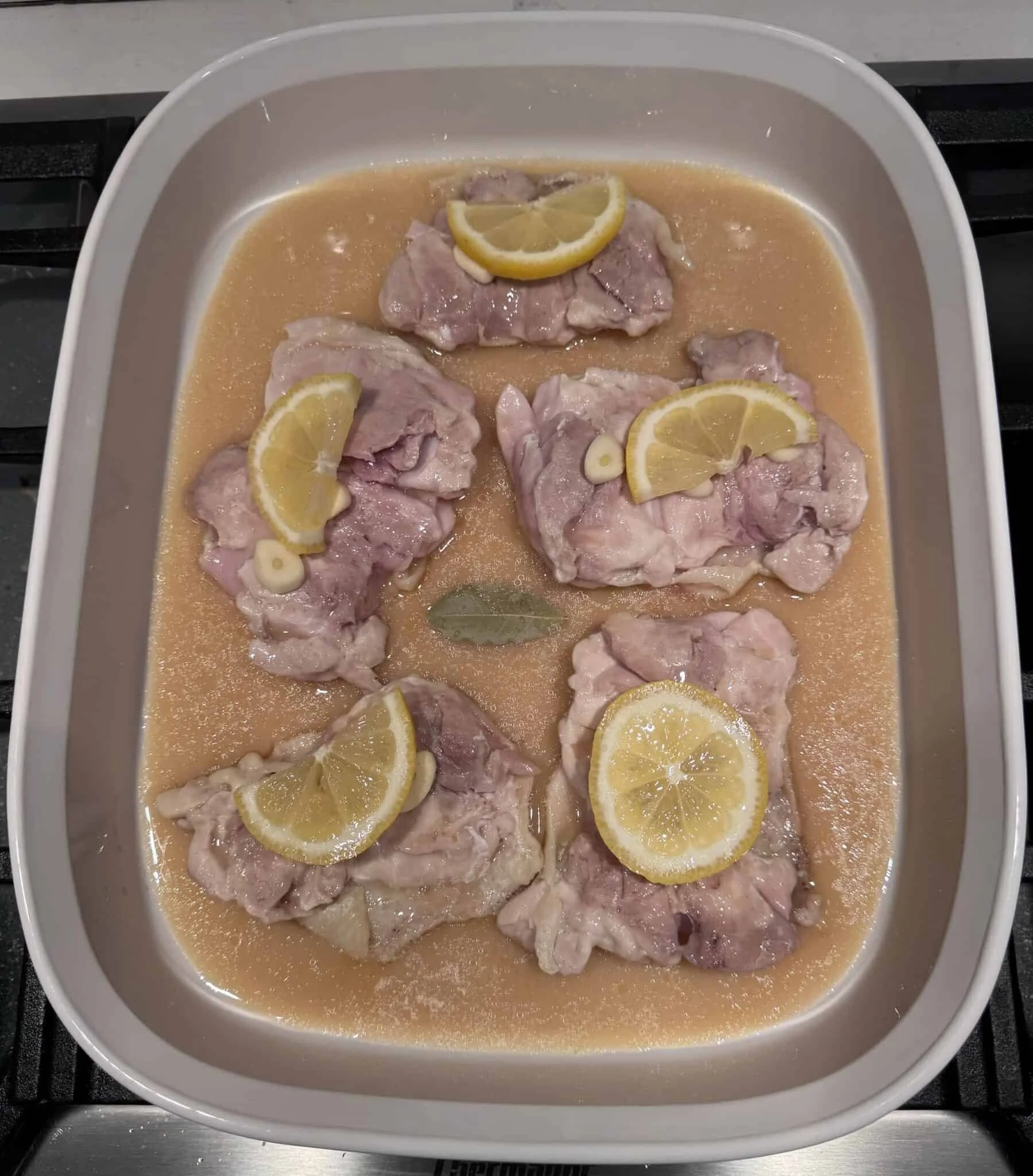 Remove just the chicken from the oven, poor the sauce into the pan, add the sliced garlic and lemon on top of the chicken. Place the chicken pan back in the oven. Set timer for 15 minutes.
