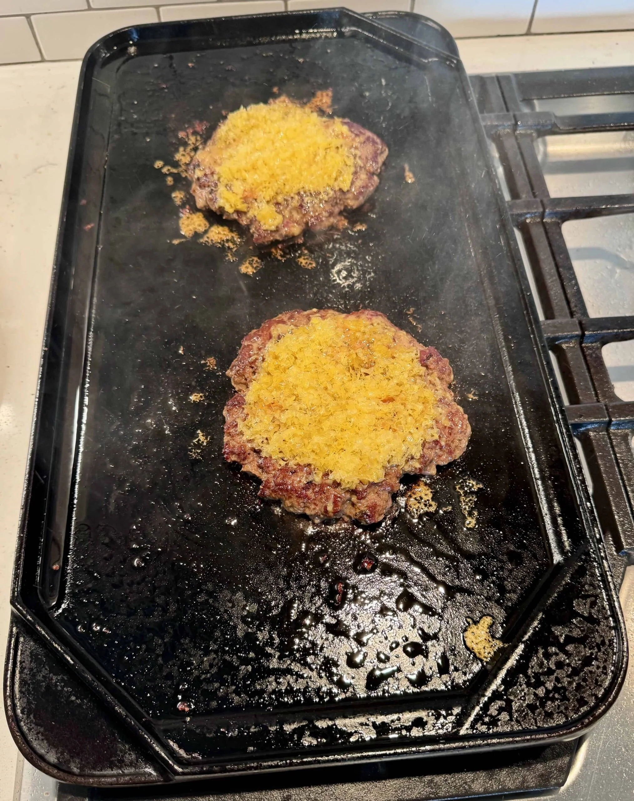 Heat Grill or skillet over medium-high heat. Add 2 tbsp Olive Oil. After a minute, place the balls of meat, well spaced, into the skillet. With a large spatula or small plate, press/smash the burgers to 1/4 inch thick. Turn after one minute. Place grated cheese on top of the burgers. Turn off heat after one more minute.