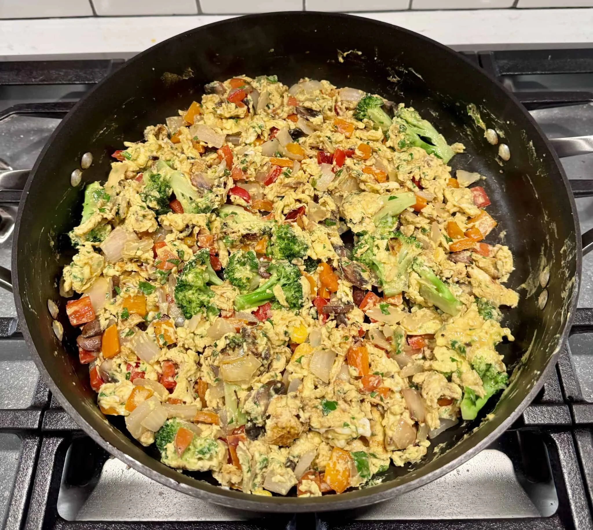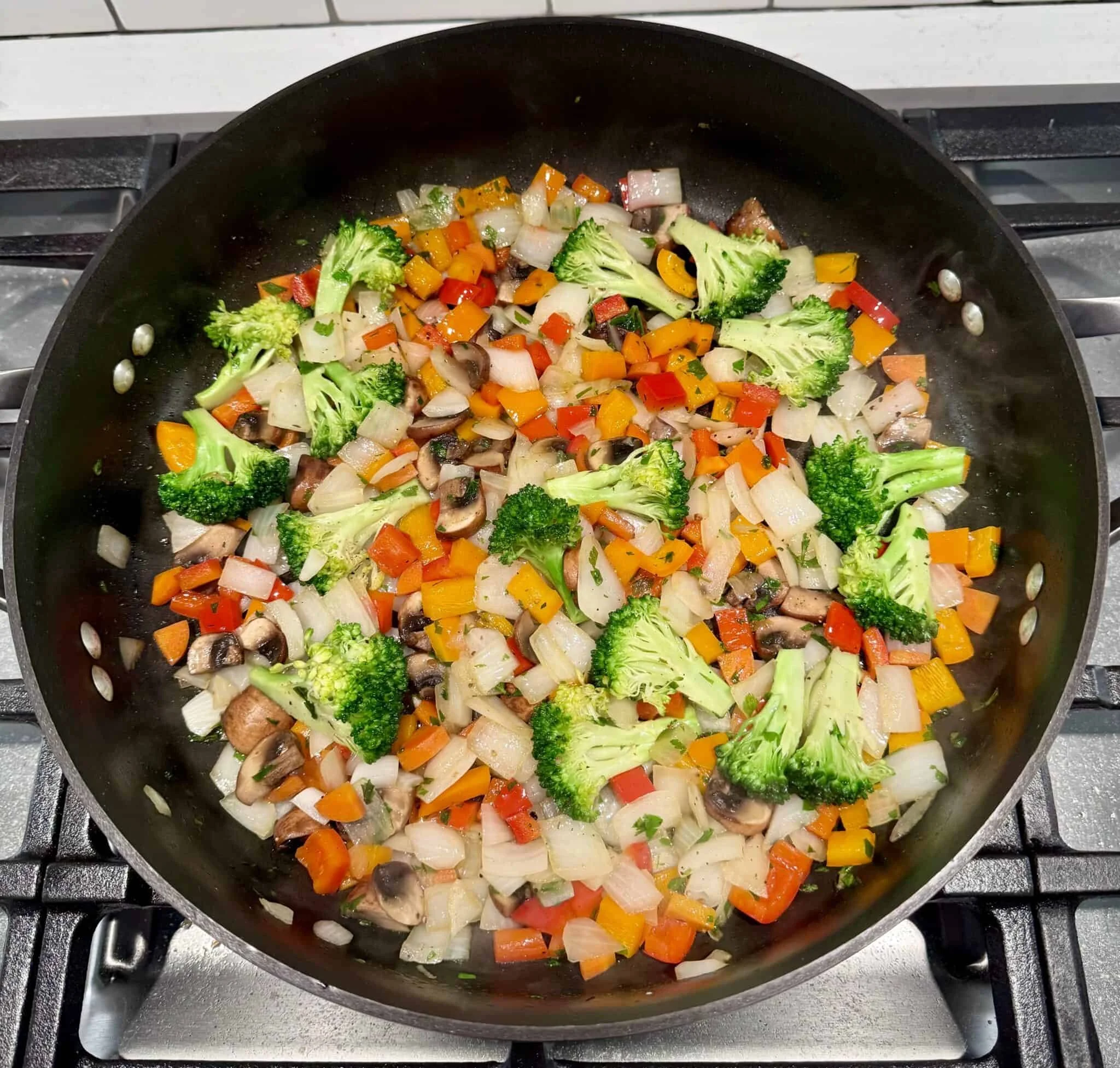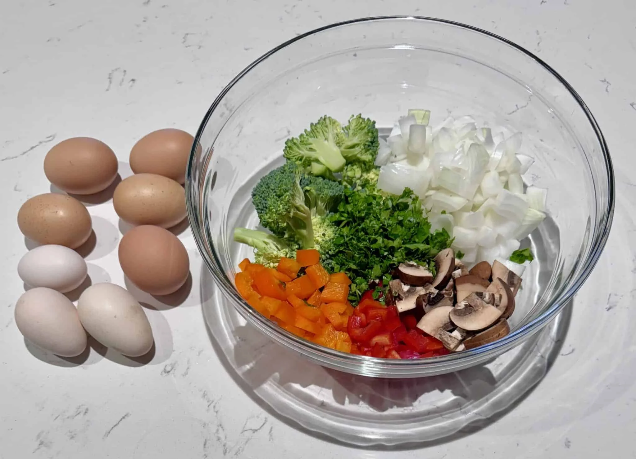 Cut up broccoli, dice the onion, peppers, slice the mushrooms and place in medium bowl. Cut the tomatoes and place in a separate bowl or on a plate.