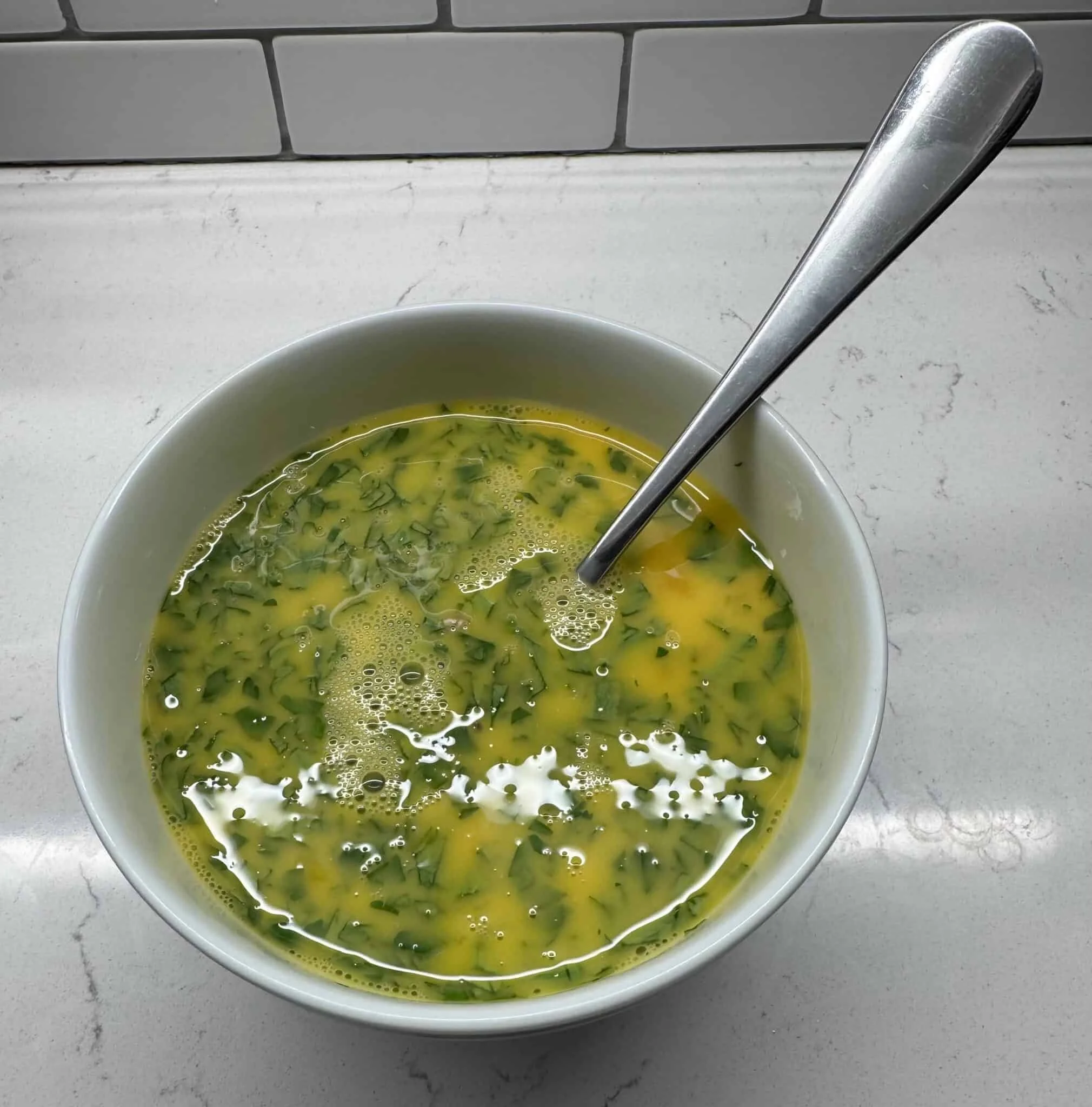 Break eggs into a large bowl, add chopped parsley, ¼ cup water, mix well with a fork. Set aside.