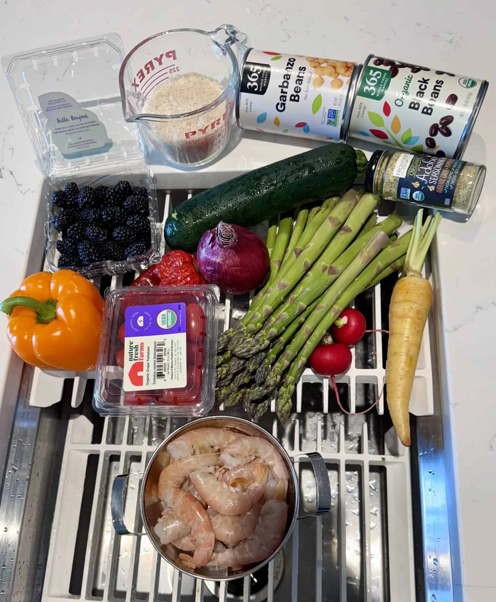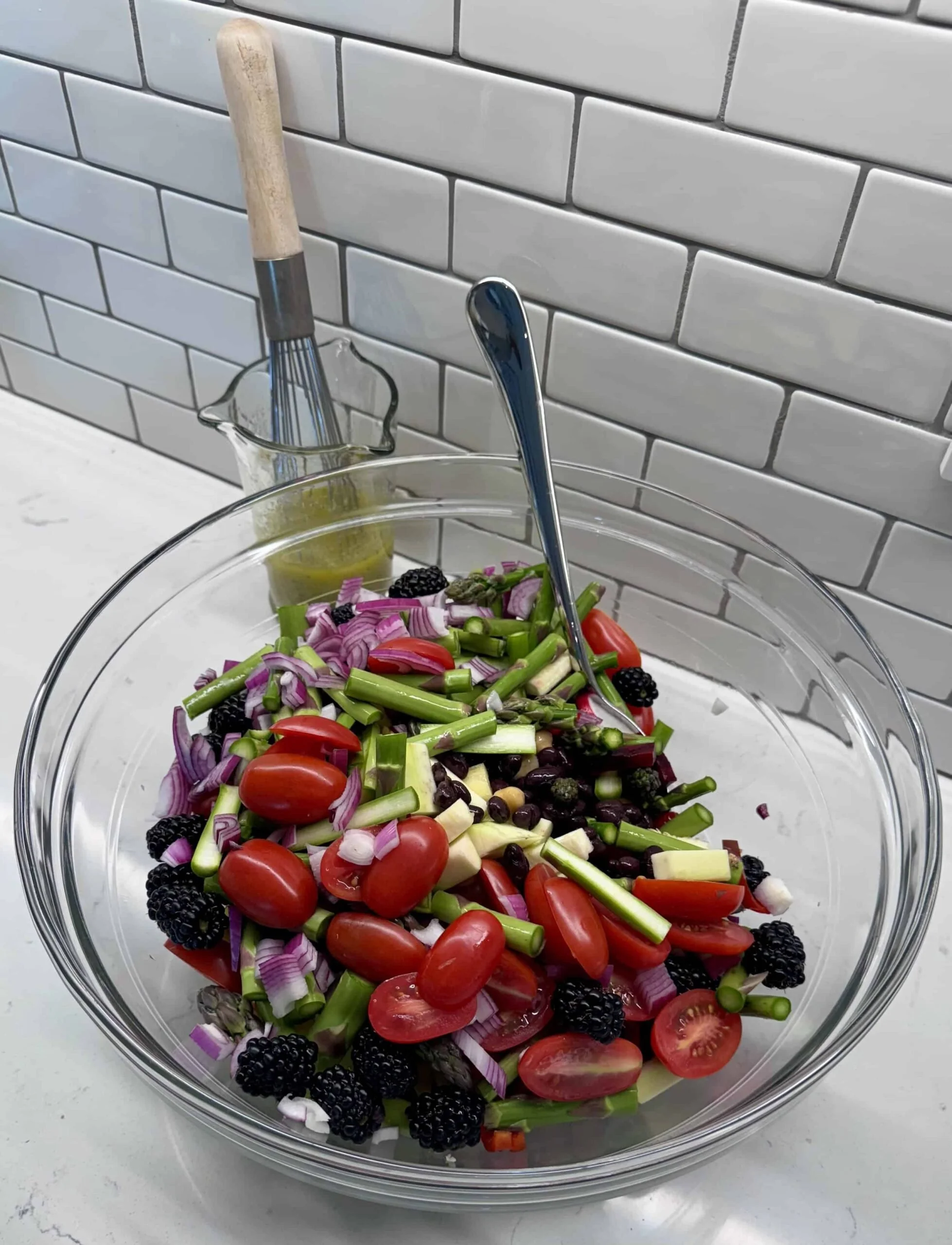 Rinse all the vegetables. Get a large bowl. Open and drain the liquid from the two cans of beans. Add the beans to the bowl. Defrost the corn in a microwave with a 2 tbsp of water. Add to the bowl. Raspberries – add to the bowl. Slice the grape tomatoes in half. Add to the bowl. Thinly slice the onion, radish and carrot. Add to the bowl. Peel the zucchini. Then cut into 3″ looking French fries. Do the same with the peppers and asparagus. Add to the bowl. Stir/whisk then add the dressing to the bowl. Stir and set aside.
