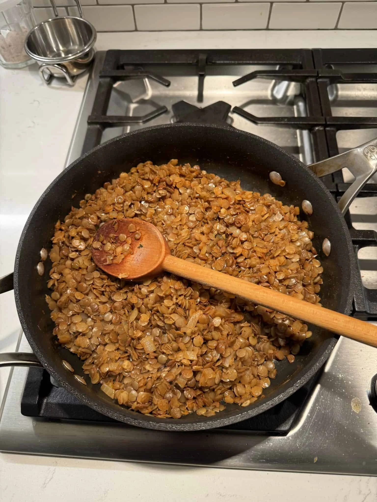 Once the onion is tender, add the drained lentils, the taco seasoning, and about a half cup of water. Stir and cook over medium heat until the mixture has thickened (about 3-5 minutes). Season to taste with salt – this will really bring out the flavors (I added one teaspoon).