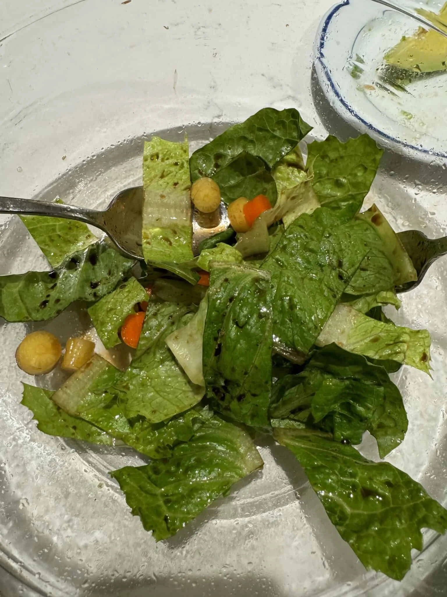 Tear some Romaine or Arugula, place in bowl. Add optional chopped carrots. Mix 2/3 cup Extra Virgin Olive Oil, 1/3 cup acid (red wine vinegar or lemon juice or balsamic), pour half mixture over lettuce, mix. Add 1/4 tsp salt, stir again. Add more dressing if needed.