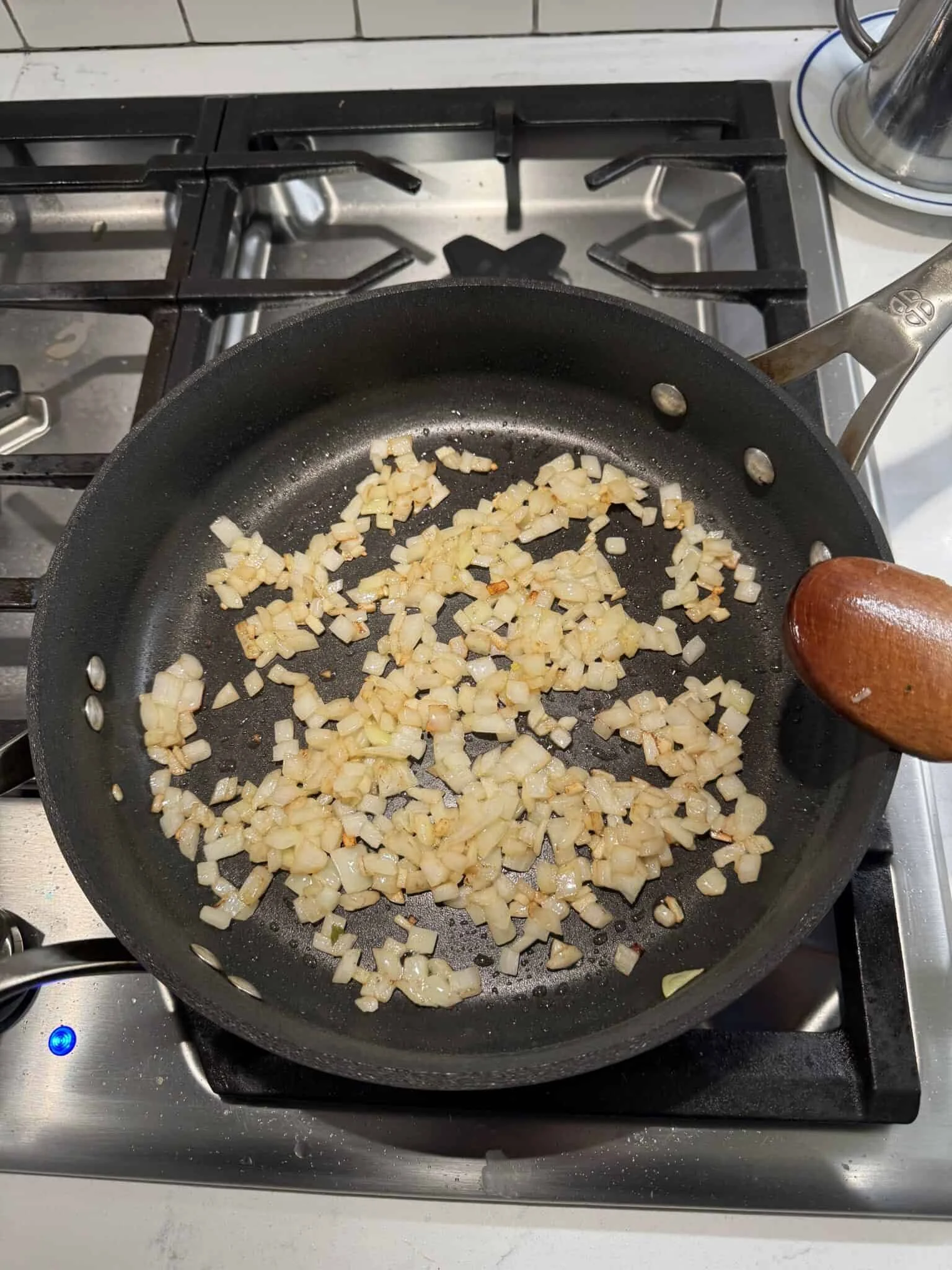 Dice the onion, mince the garlic and cook them with olive oil in a large skillet over medium heat until tender.