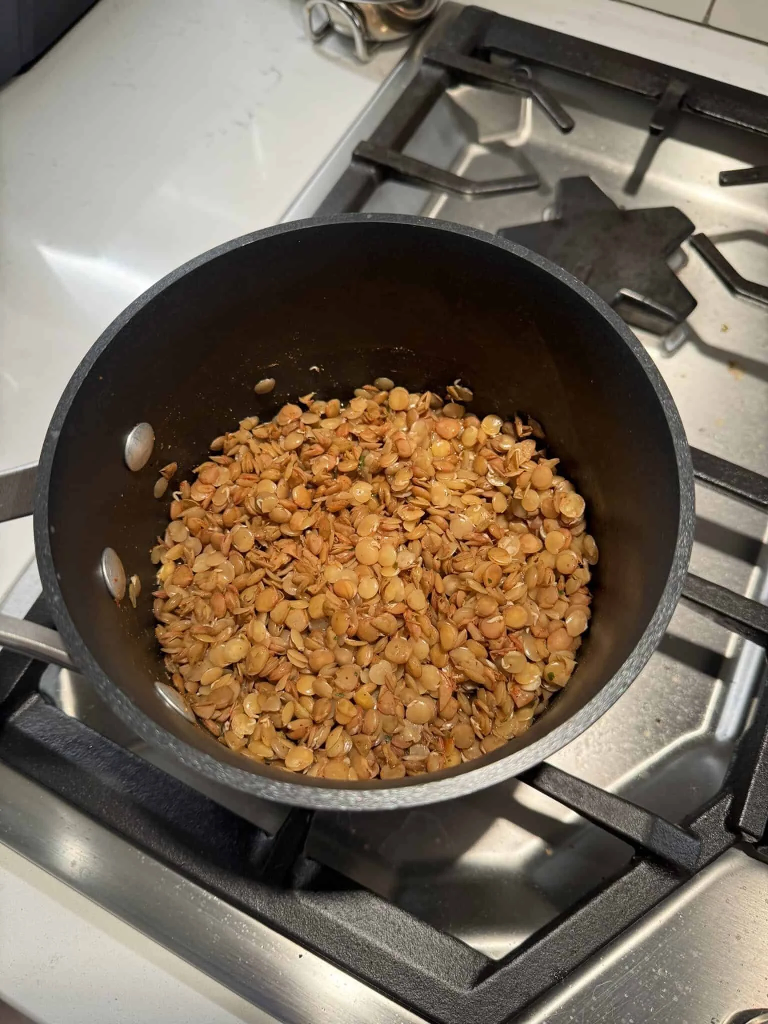 Sort and rinse the lentils. Bring 3 cups of water to a rolling boil in a medium pot. Once it reaches a boil, add the lentils. Let the pot return to a boil, then reduce the heat to low, place a lid on top. Allow the lentils to simmer for 20 minutes. After 10 minutes, taste the lentils to test the texture. They should be tender but not mushy. Drain the lentils in a colander.